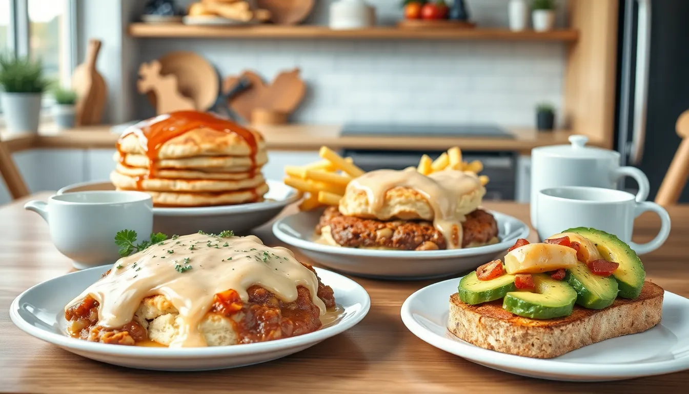 North American breakfasts have evolved with health trends and globalization. Avocado toast has gained substantial traction, serving as a nutritious interpretation of traditional dishes. Smoothie bowls topped with granola, fruits, and nuts illustrate a shift towards lighter, healthier options. Additionally, plant-based alternatives like tofu scramble and oat milk lattes have surged in popularity. Fast-casual dining also offers innovative twists, including gourmet sandwiches and artisanal coffee blends, reflecting modern tastes and lifestyles.